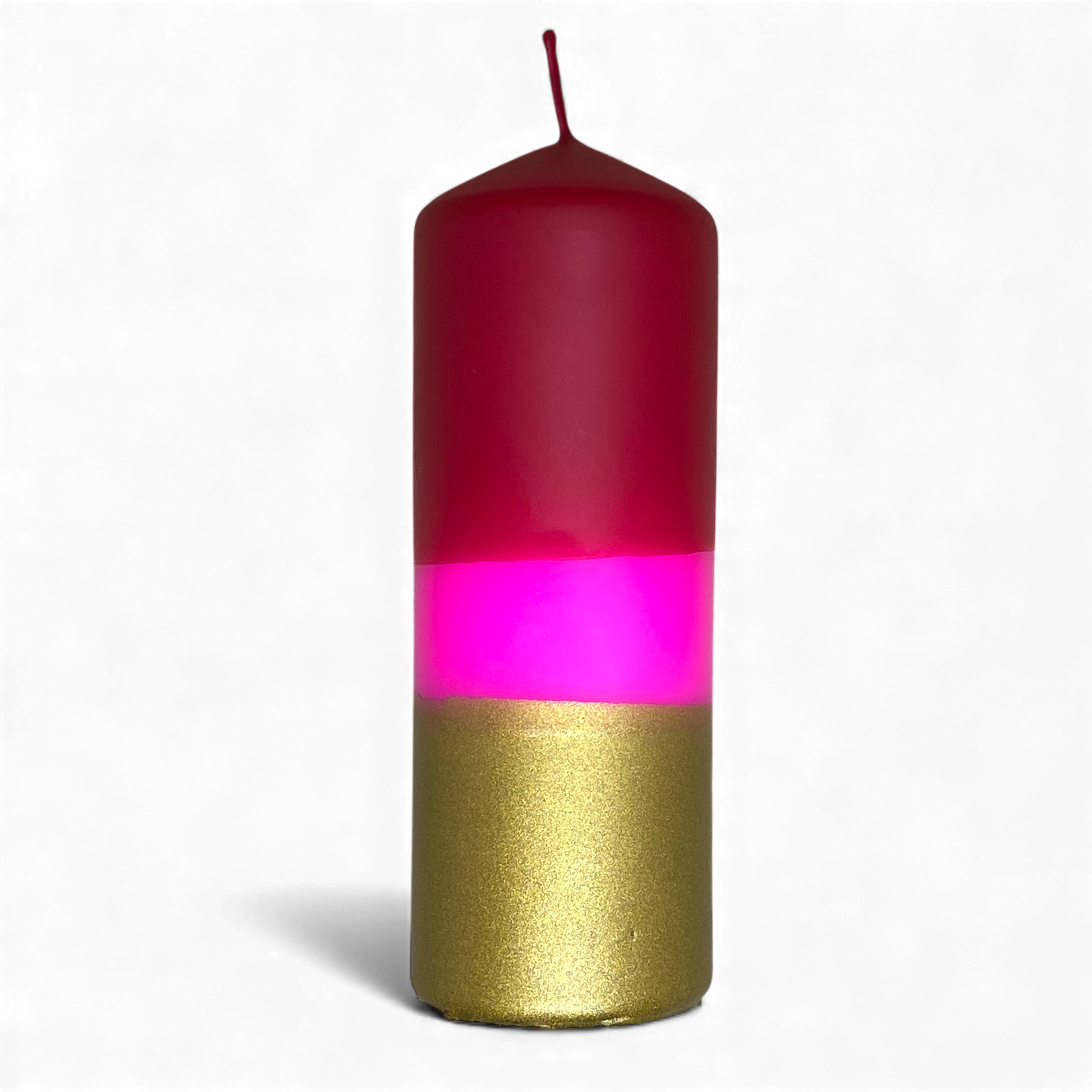 Große Stumpenkerze in gold, neonpink und bordeaux