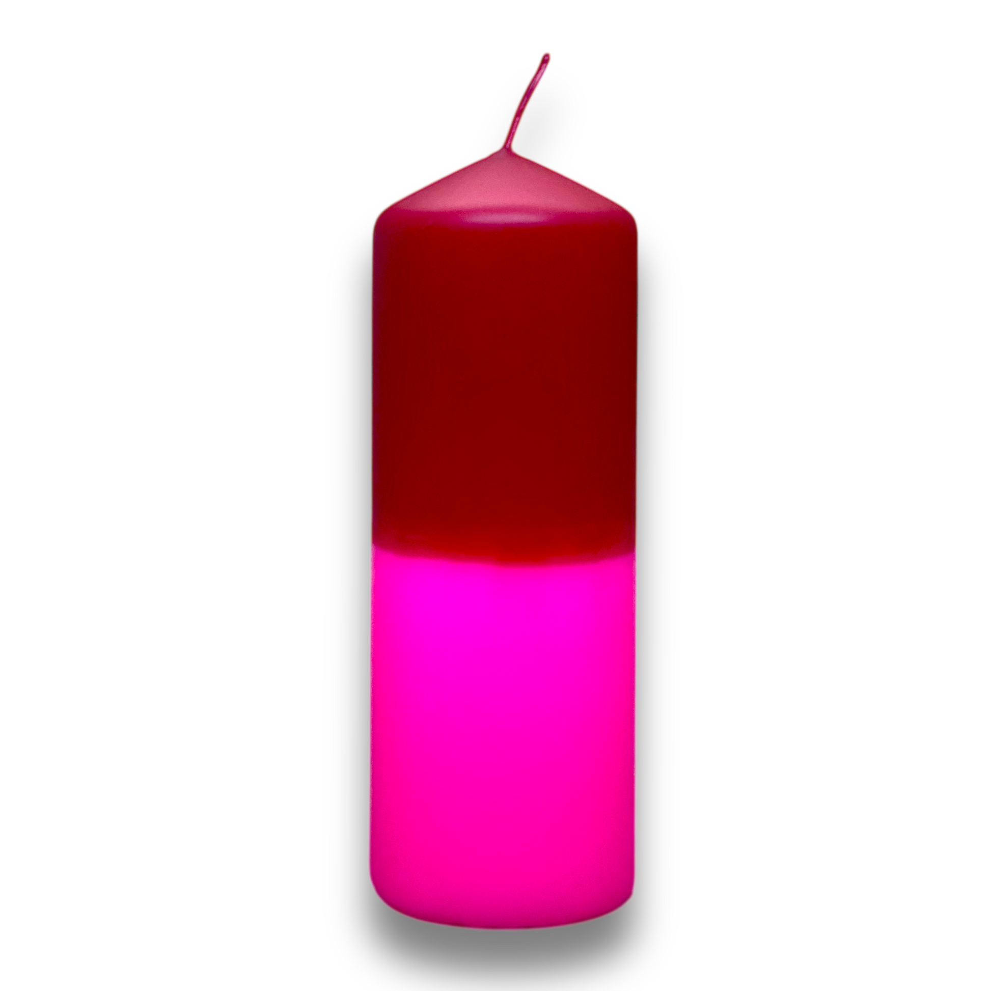 Große Stumpenkerze in den Farben pink und bordeaux.