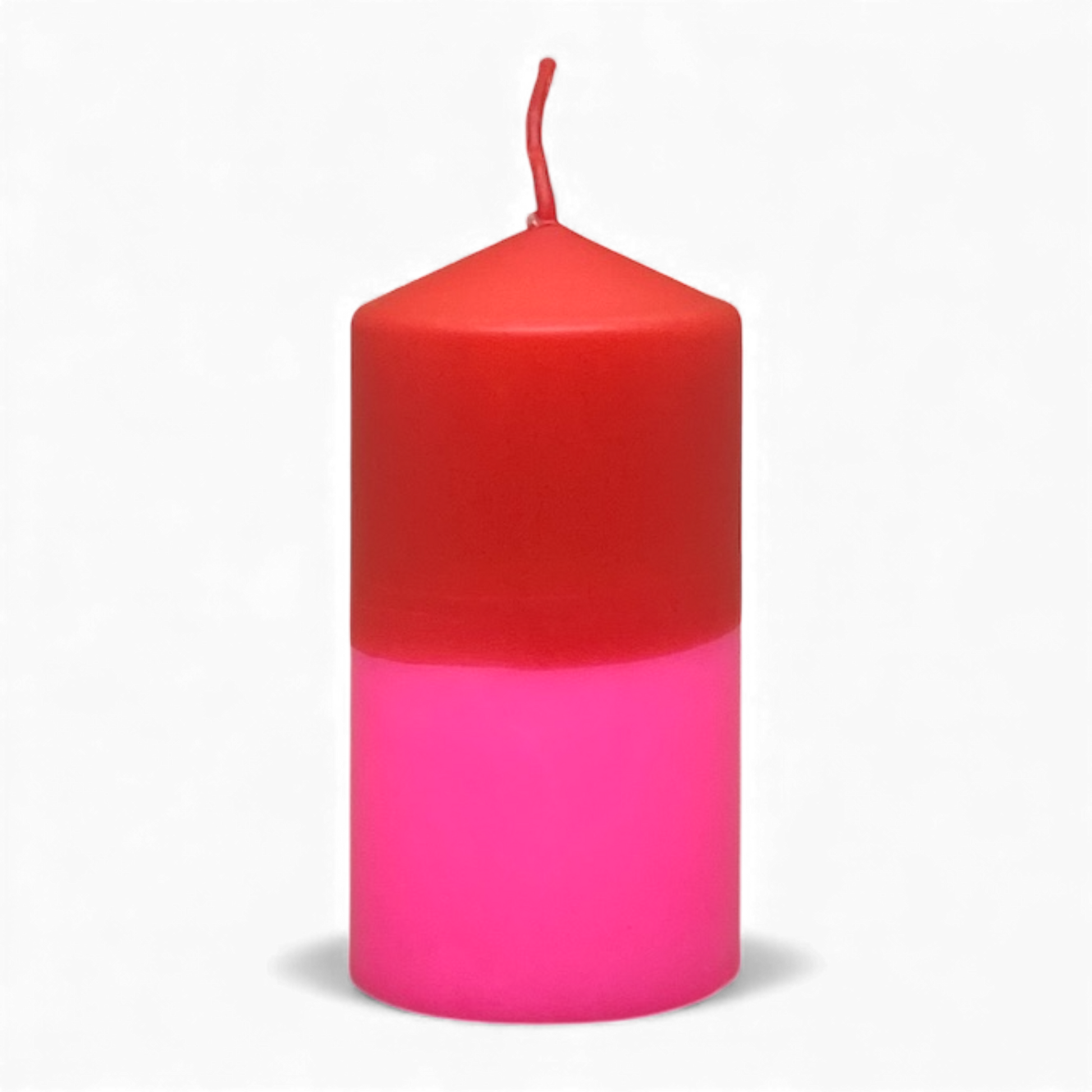 Stumpenkerze aus Paraffin in den Farben neonpink und rot.